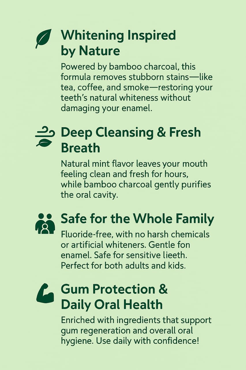 OUR Bamboo Charcoal Toothpaste is your natural, gentle, and effective solution. Designed for the whole family, this fluoride-free formula combines deep cleansing power with safe ingredients to give you the bright, fresh, healthy smile you deserve—without harsh chemicals.